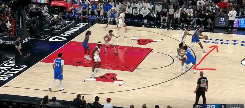 同样的战术发起下,麦凯恩的随机应变能力则让战术更加多变,正常来说借维金斯的掩护后要来到弧顶手递手,但麦凯恩利用吉迪和理查兹过去靠外的站位选择直接卷切: